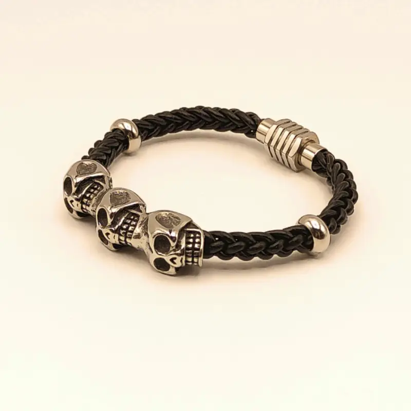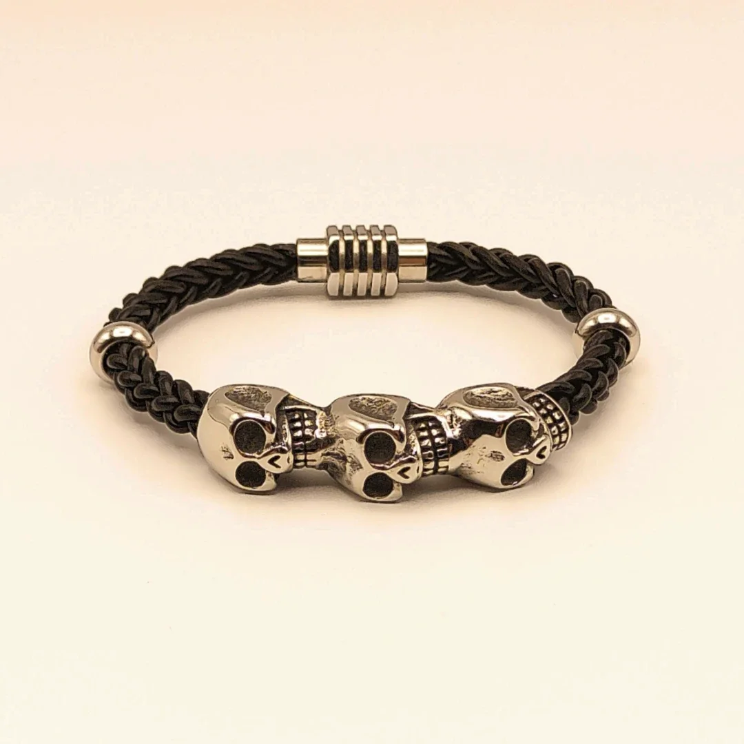 Ce bracelet en cuir tressé à la main par L'Empreinte du Chat, orné de trois crânes en acier. Son fermoir magnétique en acier inoxydable garantit une fermeture sûre et hypoallergénique.