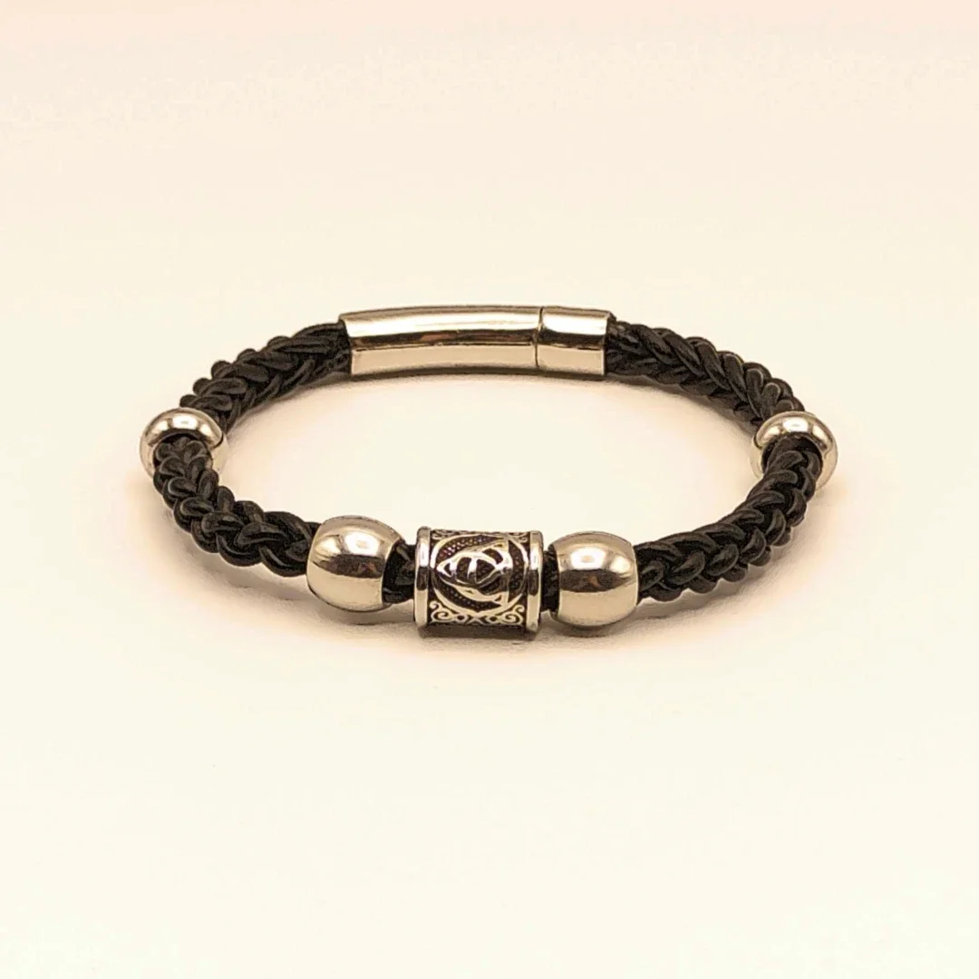 Ce bracelet en cuir tressé à la main par L'Empreinte du Chat est orné d'une perle avec un motif de nœud celtique. Le nœud celtique symbolise l’éternité et l’interconnexion, ajoutant une touche mystique et historique à ce bracelet robuste et élégant.