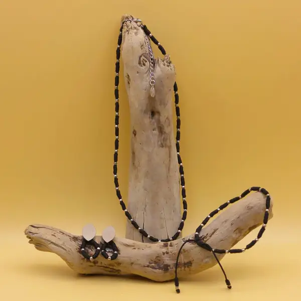 Découvrez notre Parure Élégance. Fabriquée à la main par L'Empreinte du Chat, cette parure comprend un collier, des boucles d’oreilles et un bracelet assorti, chaque pièce est un témoignage unique de l’artisanat.
