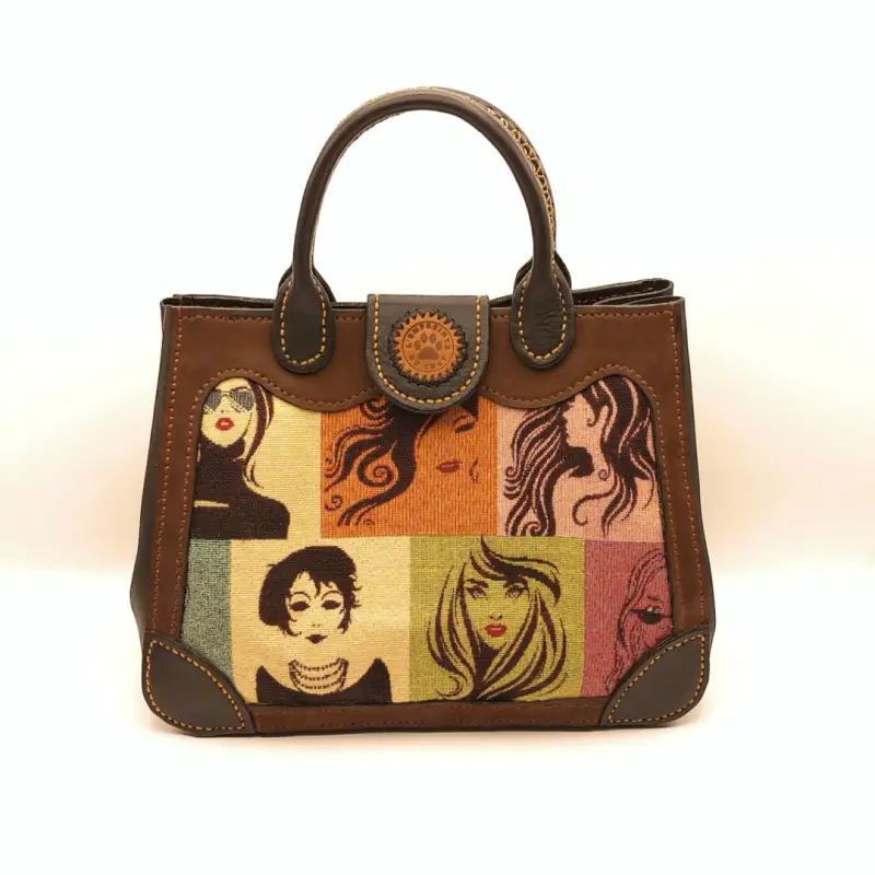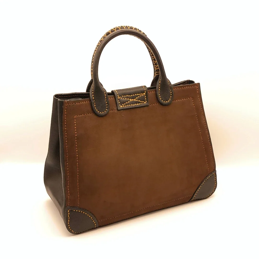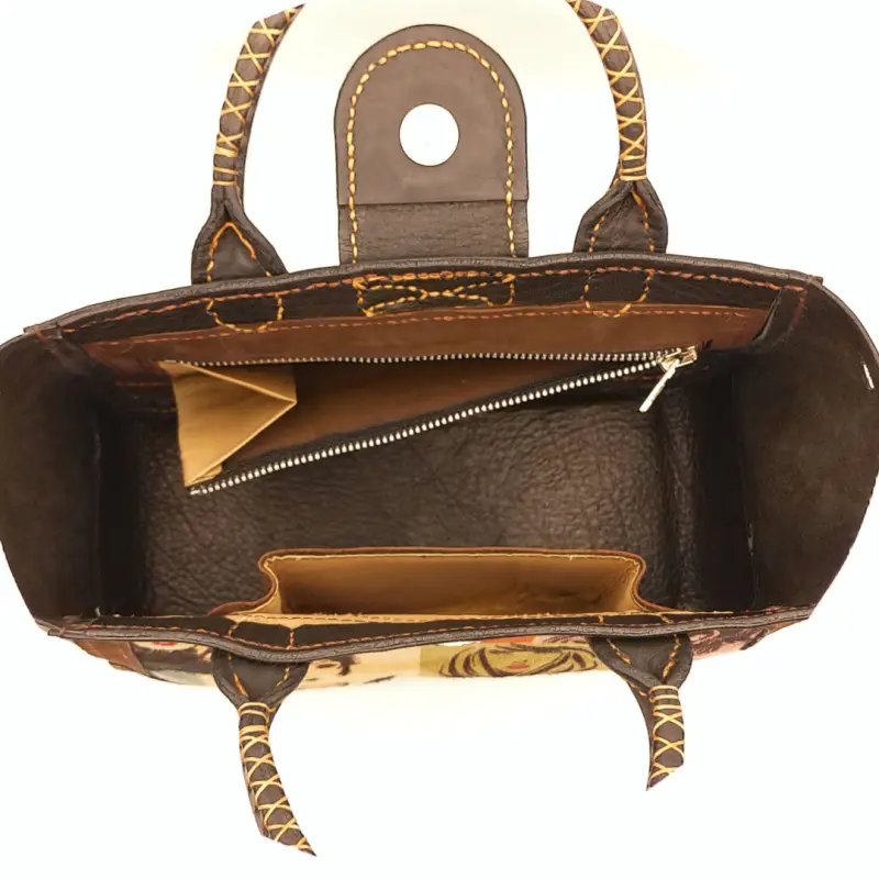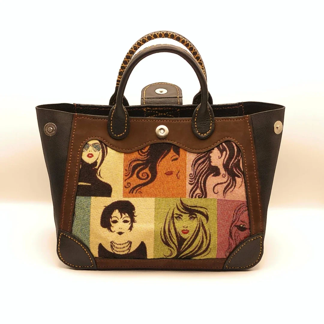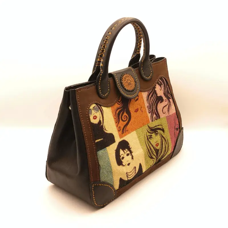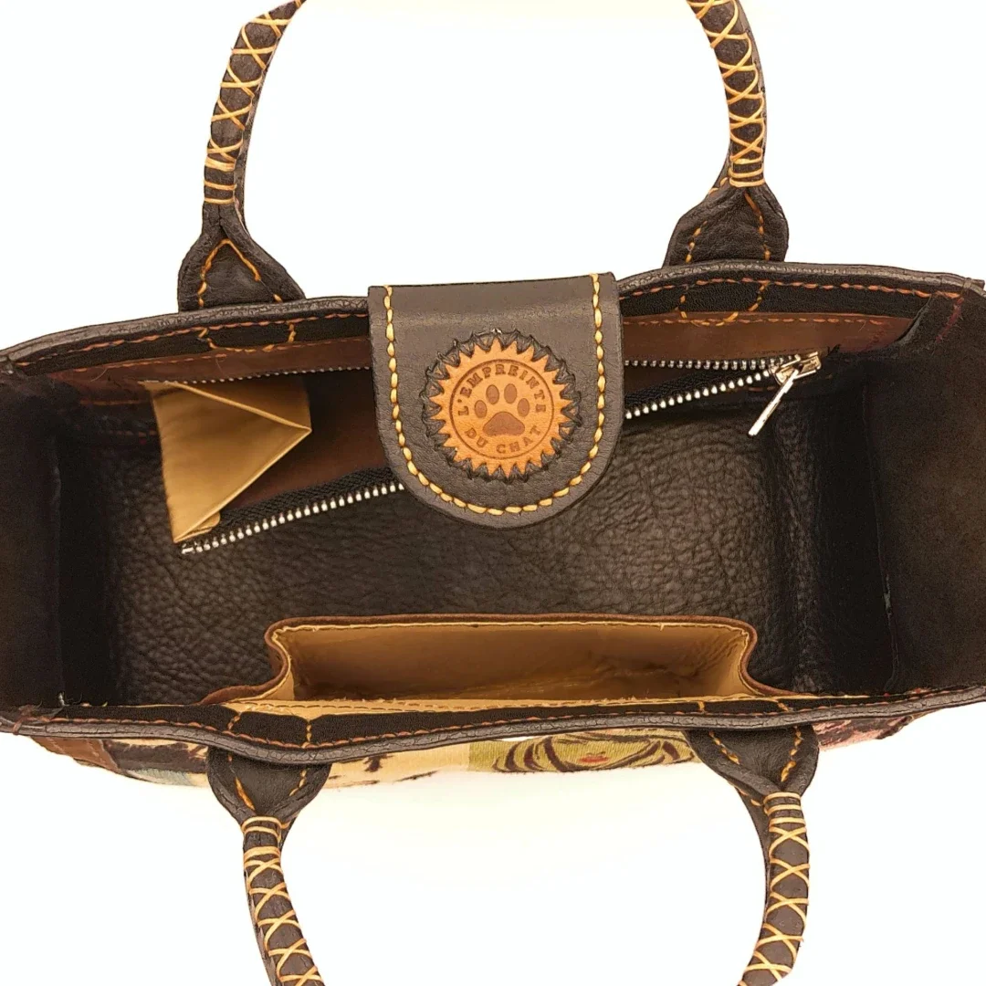 Sac à main réalisé à la main par L'Empreinte du Chat. Cuir vachette noir et marron et tissu brodé.